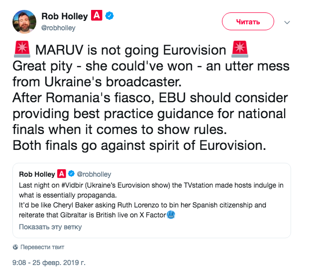 "Maruv не едет на Евровидение. Очень жаль – могла бы победить", – пишет журналист Роб Холли.