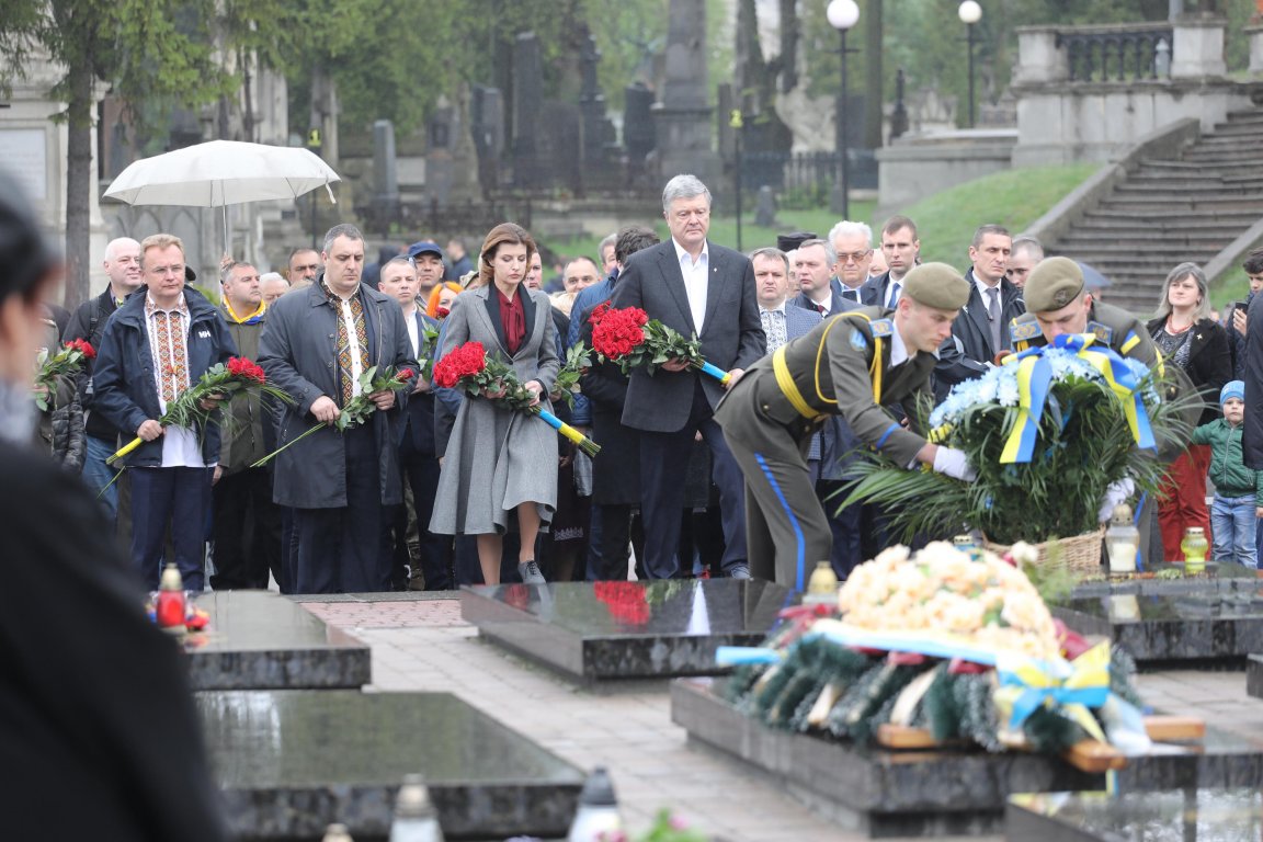Президентская семья в окружении местных мэра, губернатора и главы облсовета (все трое в вышиванках) под дождем на Лычаковском кладбище возложили цветы к могилам погибших на Майдане и в АТО.