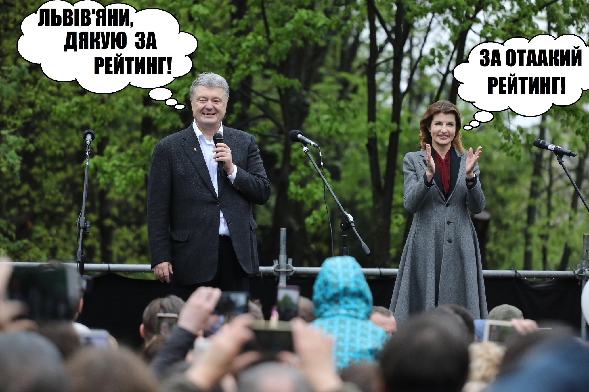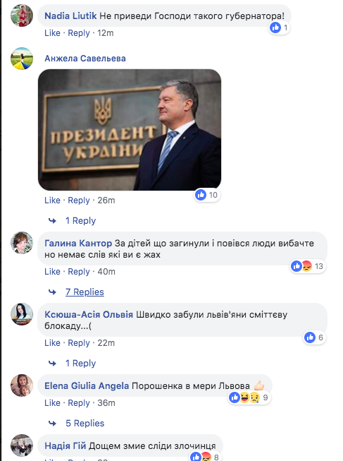 Во львовских группах в соцсетях некоторые язвили: "Порошенко - в мэры Львова", "Прощальная гастроль артиста", "Облейте пана Порошенко ведром воды. Не изменяйте традициям обливного понедельника" (во Львове есть традиция поливать прохожих водой на второй день Пасхи).