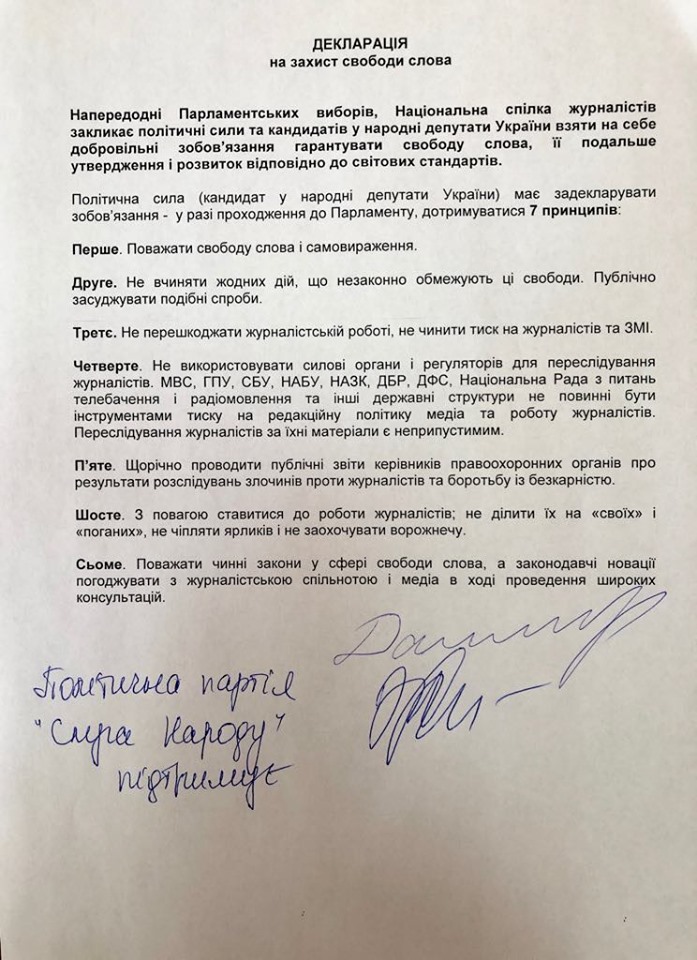 Глава партии "Слуга народа" Дмитрий Разумков подписывает Декларацию о защите свободы слова