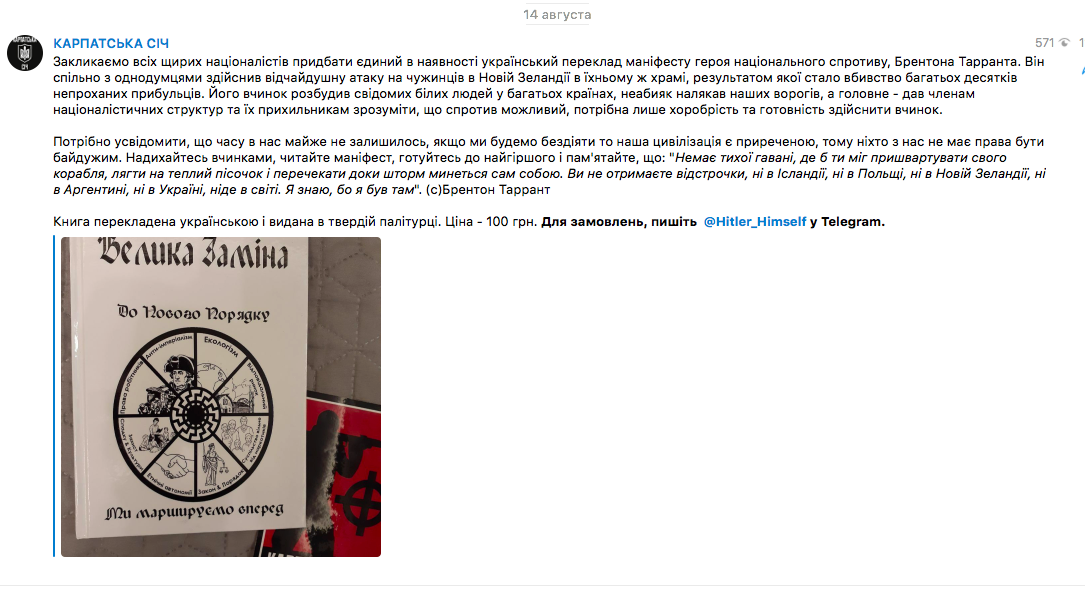 "Призываем всех честных националистов приобрести единственный украинский перевод манифеста героя национального сопротивления Брентона Тарранта. Он совместно с единомышленниками совершил отчаянную атаку на инородцев в Новой Зеландии в их же храме, результатом которой стало убийство многих десятков незваных пришельцев. Его поступок разбудил сознательных белых людей во многих странах, изрядно напугал наших врагов, а главное - дал членам националистических структур и их сторонникам понять, что сопротивление возможно, нужна только храбрость и готовность совершить поступок", – призывают украинские ультраправые из "Сичи" в своем Telegram-канале.
