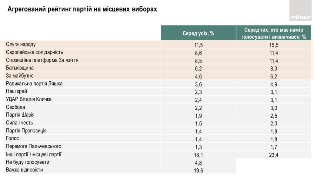 В отдельных регионах ЗБ вообще заняла первое место в списке партий. Например, согласно опросу все той же группы "Рейтинг", в Белоцерковской объединенной территориальной общине поддерживают ЗБ более 40% респондентов.