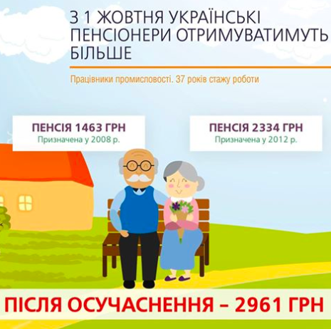 А вот еще один пример от премьера. Работник промышленности с 37-летним стажем, вышедший на пенсию в 2008 году, получает 1463 гривны. Вышедший на пенсию в 2012 году, получает 2334 гривны.