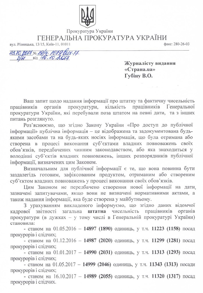 Три недели назад по структуре ведомства было запущено письмо, подписанное генпрокурором Юрием Луценко. В этом документе фигурирует проект расчета новой штатной численности центрального аппарата ведомства.