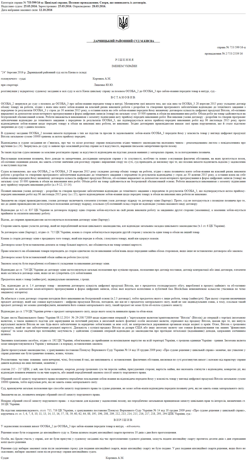 В свою очередь жертвами мошенников становятся порой даже не новички в мире виртуальной реальности. Например, предметом судебного дела стало мошенничество в отношении программиста – он создал на заказ программу, но оплаты за свой труд в биткоинах так и не получил.