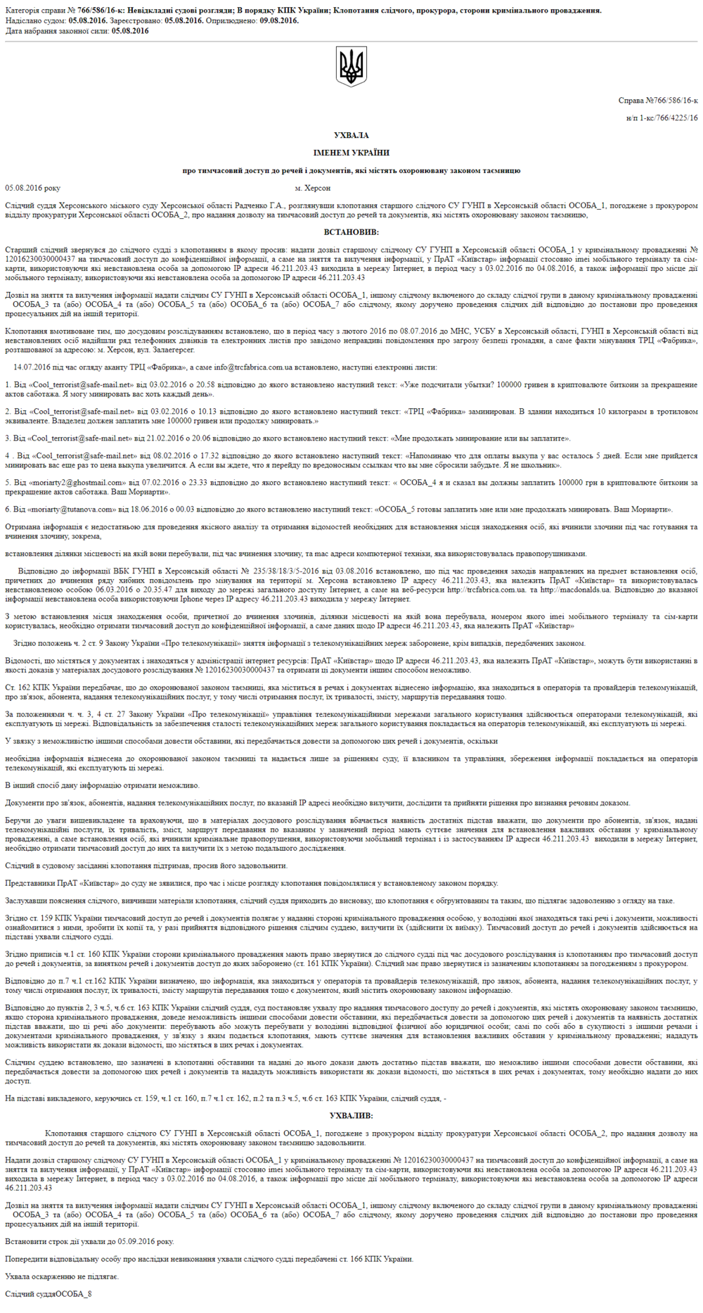Судя по тексту судебного документа, IТ-менеджеры торгового центра попытались защититься и самостоятельно вычислить электронного рэкетира, послав ему ответ со специальными "фишинговыми" ссылками, куда рекомендовалось зайти вымогателю — если бы он зашел на них, электронный адрес херсонского минера стал бы тотчас известен. Однако вымогатель оказался не новичком в нюансах виртуального мира, он ответил: "Напоминаю, что для оплаты выкупа у вас осталось 5 дней. Если мне прийдется минировать вас еще раз, то цена выкупа увеличится. А если вы ждете, что я перейду по вредоносным ссылкам, что вы мне сбросили, забудьте. Я не школьник".