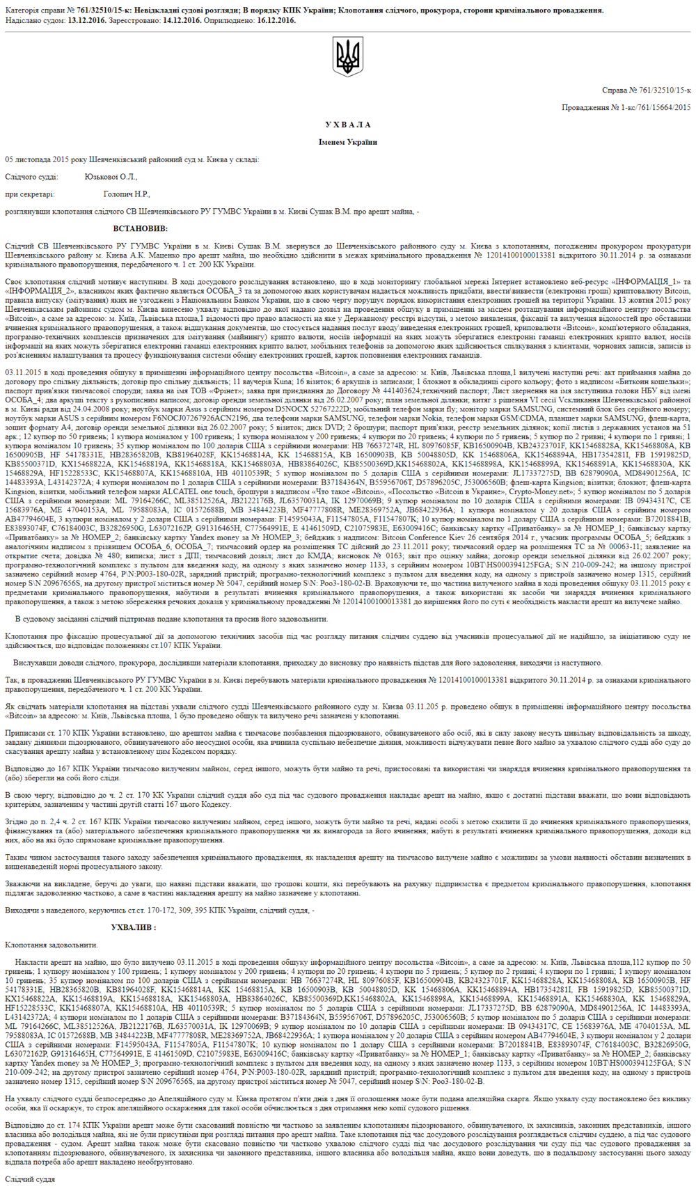 В реестре действительно мы насчитали десятки дел, повествующих о жестком прессинге предприятий, которые имели смелость перевести часть своих платежей в криптовалюту. Например, в деле говорится об обыске в "Посольстве Биткоин в Украине", во время которого еще в ноябре 2015 года были изъяты оборудование, документы и деньги. Но не виртуальные, а вполне реальные.