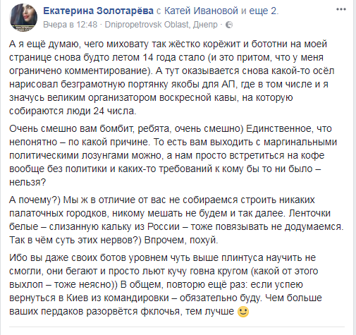 Пропрезидентский блогер Екатерина Золотарева тоже активно защищает воскресную акцию на Майдане: