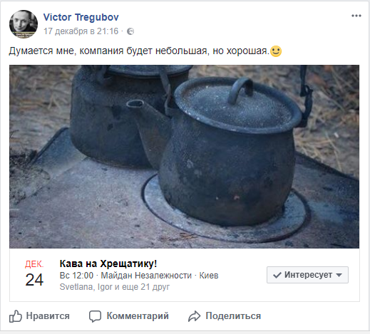 Характерно, что на митинг людей созывают, обыгрывая известный пост Мустафы Найема, с которого три года назад начинался Евромайдан. "На кофе и общение с друзьями ждем киевлян, гостей города и отдельно героев нашего времени, настоящих участников войны с восточным соседом! С собой иметь хорошее настроение, кофе в термосах, бутерброды и конфеты Рошен! Цель - показать обществу несколько иную картинку, чем еженедельные политические вакханалии и попытка штурма Октябрьского дворца!", - говорится в описании мероприятия в соцсети.