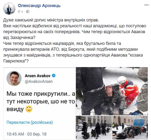 Основную же часть протестующих попросту "скрутили". Часть из них поставив на колени в снежные сугробы. Именно это фото, вкупе с ехидным комментарием министра внутренних дел Авакова (о нем ниже) и вызвало огромное возмущение.