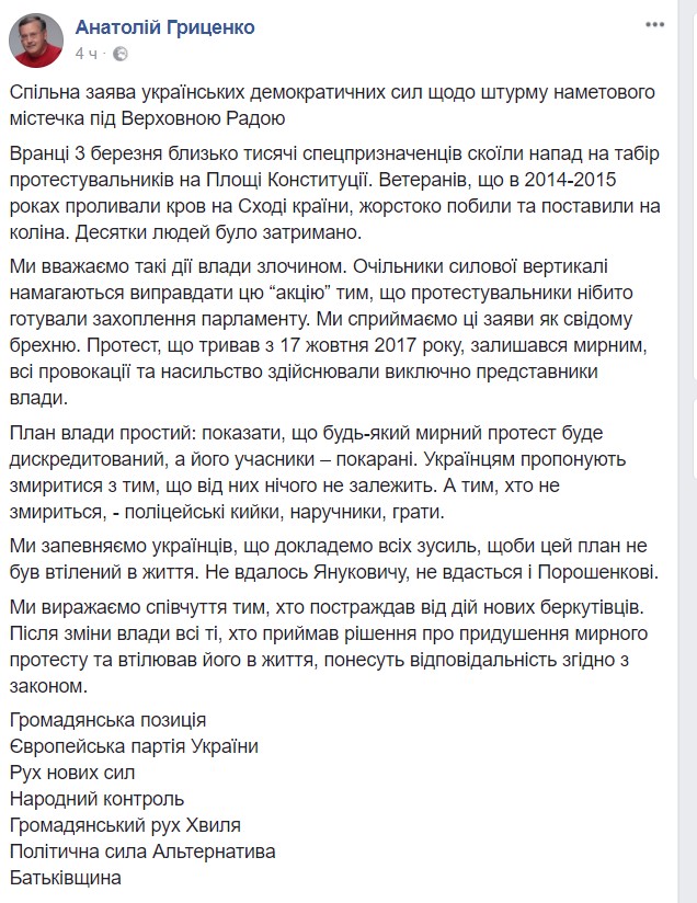 По крайней мере, вечером 3 марта было обнародовано заявление семи политических сил, в котором разгон палаточного городка назван преступным, а Порошенко сравнивают с Януковичем.