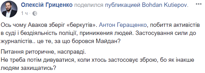 И якобы в рамках этих договоренностей Аваков и отдал приказ на применение силы к протестующим. Хотя ранее он не горел желанием это делать (по распространенной версии – из-за стремления ослабить позиции Порошенко, с которым НФ вел трудные переговоры об объединении).