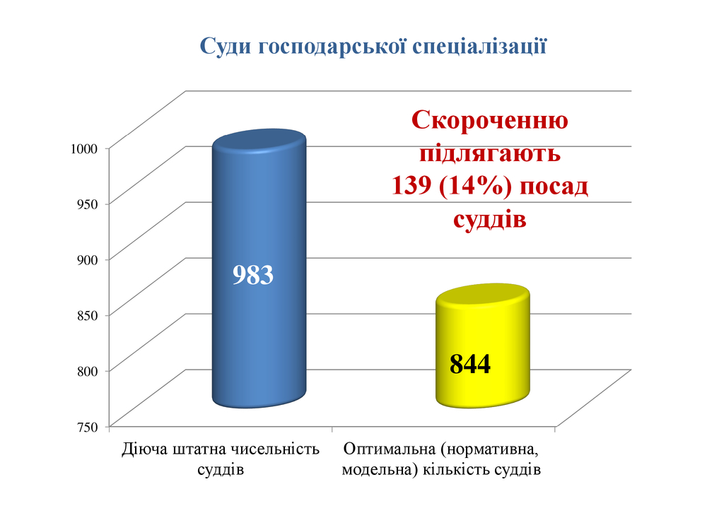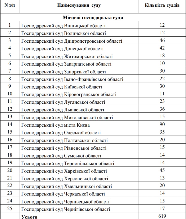 Этим актом закреплены нормы о том, что с 1 сентября прошлого года в 25 работающих хозсудах первой инстанции (без Севастополя и Крыма) устанавливается общая численность судей в количестве 619 человек. А с учетом 225 служителей Фемиды, отправляющих правосудие в апелляционных хозсудах, суммарный состав (без учета ВХСУ) составил 844 судьи хозяйственной юрисдикции. Такая штатная численность называлась в ГСА оптимальной, или же – "модельной".