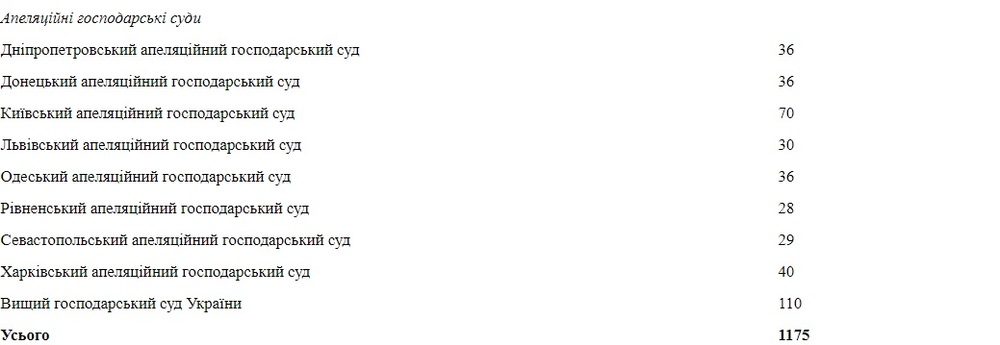 - в 3-4 раза "срезать" штат судей в хозяйственных судах первой инстанции сразу 7 областей: Донецкой, Луганской, Ровенской, Тернопольский, Хмельницкой, Черновицкой и Черниговской.