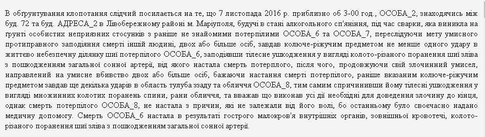 Как поначалу утверждало следствие, когда просило суд арестовать подозреваемого, "азовец", будучи в состоянии алкогольного опьянения, во время ссоры, возникшей на почве личных неприязненных отношений, нанес жертве смертельный удар ножом в область шеи. Смерть убитого наступила в результате повреждения сонной артерии: он погиб от сильного кровотечения.