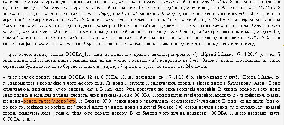 Две свидетельницы, которые общались с посетителями в ночном клубе, сообщили, что первая компания состояла из военнослужащих батальона "Азов". И когда в кафе зашла вторая компания, один из "азовцев" сказал, что это "менты, и их надо избить".