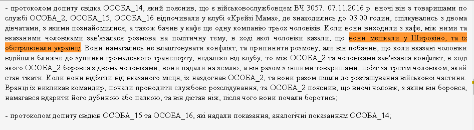 Ясность в причины конфликта внес свидетель из компании "азовцев". Он сообщил следствию, что при выходе из кафе между двумя компаниями завязался разговор на политическую тему. В нем "местные" сказали, что они "жили в Широкино, и их обстреливали украинцы".