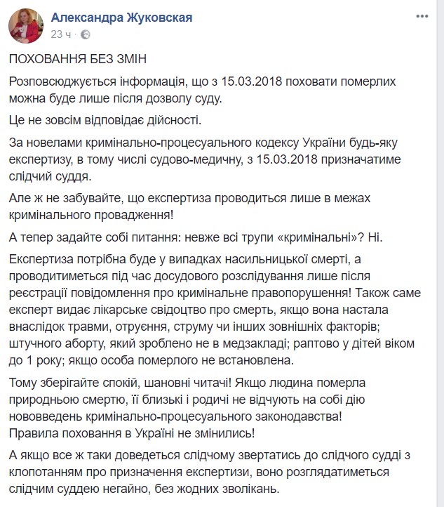 Вторит ему и его коллега – судья Дубенского райсуда Ровенской области Александра Жуковская. "Задайте себе вопрос: неужели все трупы "криминальные"? Нет... Если человек умер естественной смертью, его близкие и родственники не испытают на себе действия нововведений уголовно-процессуального законодательства. Правила погребения в Украине не изменились! А если все-таки придется следователю обращаться к следственному судье с ходатайством о назначении экспертизы, оно будет рассмотрено немедленно и без каких-либо проволочек", – рассуждает судья на своей странице в Facebook.