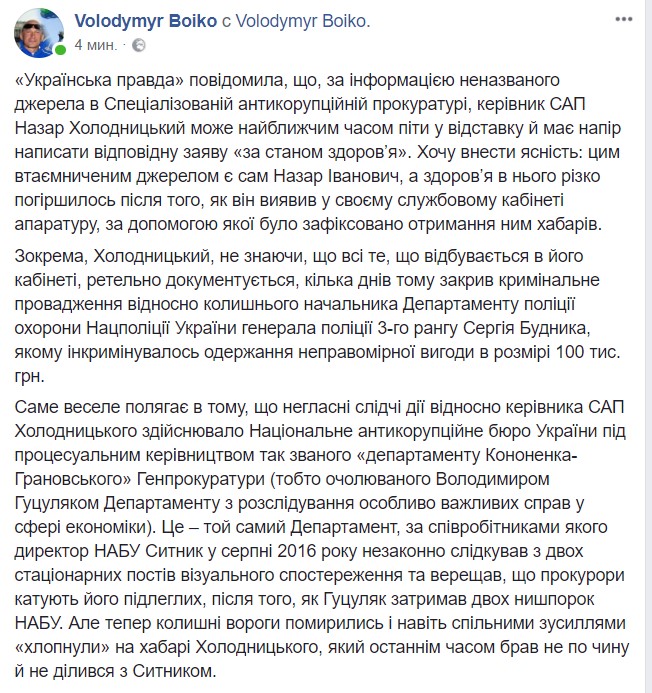 Ведь, как пишет журналист Владимир Бойко, Холодницкого де-факто задокументировали на взятке при "решалове" именно уголовного производства в отношении милицейского генерала. Якобы не зная о том, что его кабинет находится "под колпаком", глава САП благословил закрытие соответствующего уголовного дела против Будника.