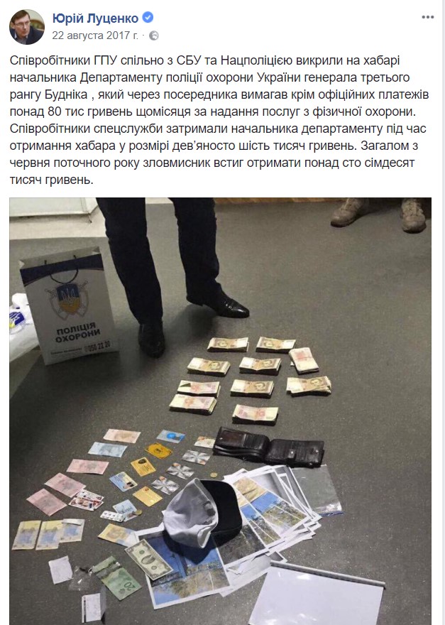 Пост генпрокурора, посвященный задержанию генерала МВД, источник фото: facebook.com/LlutsenkoYuri