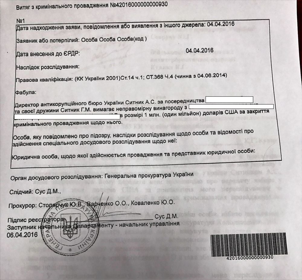 Он обнародовал выписку из ЕРДР, где указывалось – два года назад в Генпрокуратуре действительно начали расследование по делу о вымогательстве неправомерной выгоды (№42016000000000930) директором НАБУ и его супругой – адвокатом Анной Сытник. По этому производству в отношении Артема Сытника (по санкции суда) осуществлялись негласные следственно-розыскные действия, его переговоры фиксировались, а за передвижениями руководителя Бюро следили "топтуны".