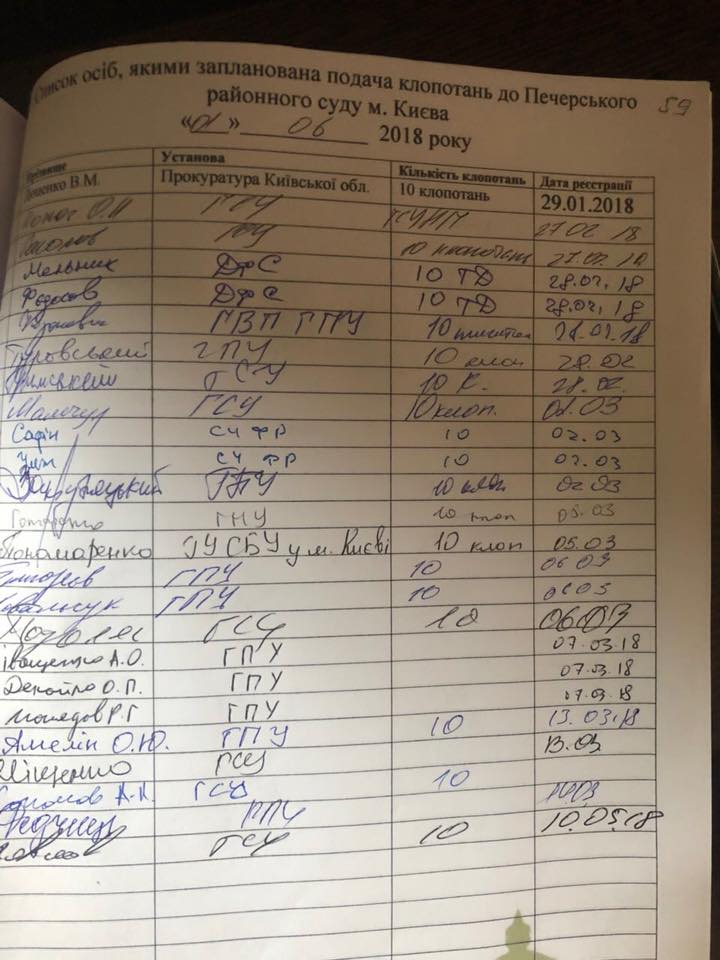 В подтверждение этого Луценко привел фотографии того, как сформирована "живая очередь" на право подачи ходатайств органами досудебного расследования по мерам обеспечения в уголовных производствах в Печерский райсуд Киева. Из этих документов следует, что предварительная запись уже расписана вплоть до 25 июня.