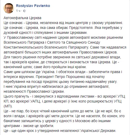 "Это канонический путь, именно им прошли другие страны. Именно этим путем идет Украина. И обязанность власти – обеспечить права и интересы верующих", – написал на своей странице заместитель главы Администрации президента Ростислав Павленко, который курирует внутреннюю и гуманитарную политику.