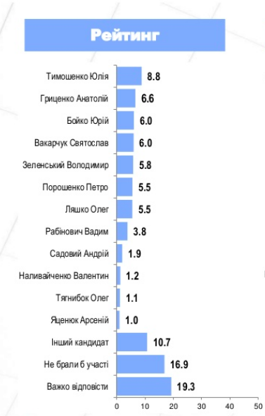 Главной новацией последнего опроса стало измерение рейтингов Зеленского и его партии "Слуга народа" (накануне замминистра юстиции Наталия Бернацкая подтвердила, что такая партия была официально зарегистрирована Минюстом), параллельно с включением в соцопросы и Святослава Вакарчука. Оба представителя шоу-бизнеса показали примерно одинаковый рейтинг, опередив Порошенко.