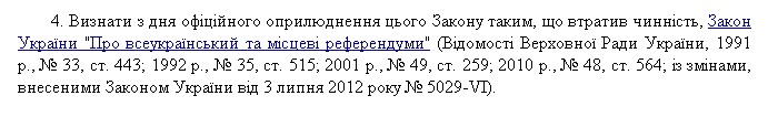 В пункте 4 Заключительных положений данного закона имелась норма, согласно которой утрачивал силу предыдущий закон "О всеукраинском и местных референдумах" от 3 июля 1991 года: