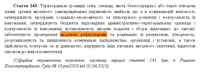 Согласно части 1 статьи 143 Конституции, проведение местных референдумов и реализацию их результатов обеспечивают территориальные общины села, поселка, города – непосредственно или через образованные ими органы местного самоуправления:
