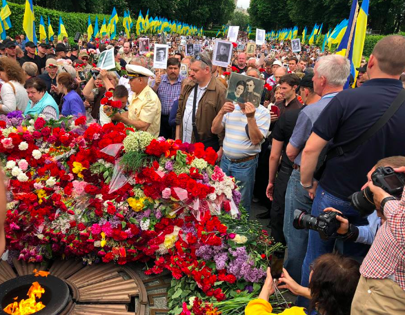 В День Победы в центре Киева прошли десятки тысяч с портретами родных, воевавших в Великой Отечественной войне. Вопреки обещаниям и угрозам националистов, они не смогли сорвать праздник. При этом людей пришло на праздник больше, чем в прошлом году, что говорит и о провале массированной кампании по дискредитации праздника, которую последний год вела власть.