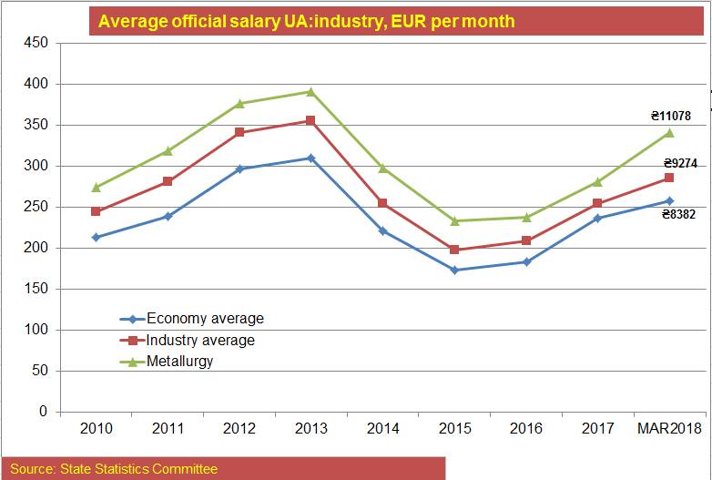 На первый взгляд, металлурги в Украине живут сравнительно неплохо. По данным профсоюза металлургов и горняков, средняя зарплата на предприятиях, добывающих руду, по состоянию на март 2018 года, составила порядка 11 тысяч грн, на предприятиях, производящих кокс и трубы, – 10 тысяч грн, на метзаводах – 12,5 тысячи грн, а на тех, которые специализируются на черной металлургии, – 13,9 тысячи грн. Это больше, чем в целом по промышленности (9,3 тысячи грн) и намного опережает средние зарплаты по стране (8,4 тысячи грн.)