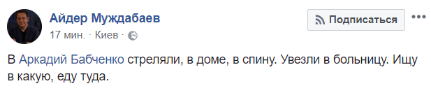 В 21:17 на странице заместителя генерального директора крымско-татарского телеканала ATR (где работал Бабченко) Айдера Муждабаева в Facebook был опубликован пост о том, что на Аркадия совершено покушение. "Стреляли в доме, в спину. Увезли в больницу", - написал Муждабаев.