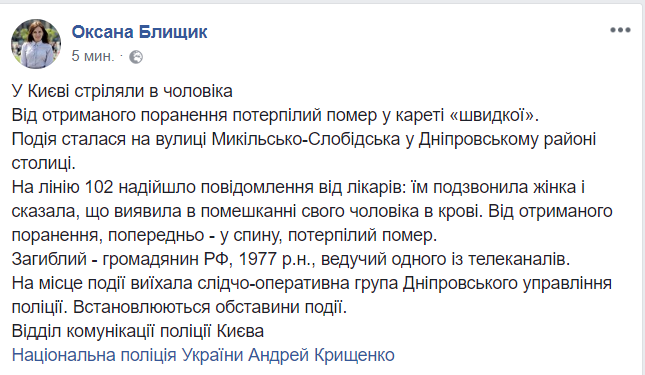 В 21:32 эти данные подтвердили в полиции Киева. Пресс-секретарь ведомства Оксана Блищик предоставила первые официальные сводки об инциденте в Днепровском районе с российским журналистом.