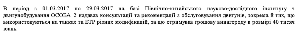 Харьковчанин получил предложение выехать в Китай для предоставления консультаций, рекомендаций, а также чтения лекций по обслуживанию двигателей, которые используются на танках различных модификаций. Почти месяц в марте 2017 года на базе Северо-китайского НИИ двигателестроения он "предоставлял консультации и рекомендации" по обслуживанию двигателей, в том числе и тех, что используются на танках и БТР.