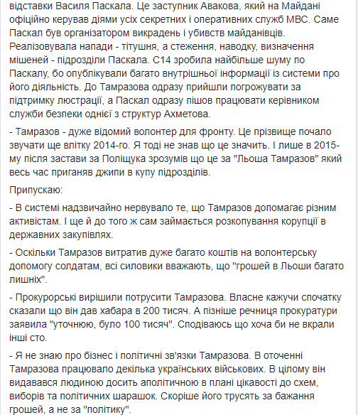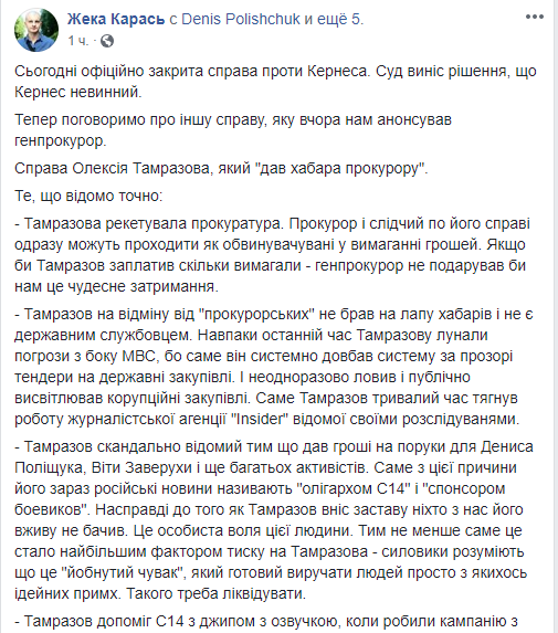 “Тамразова рекетировала прокуратура. Прокурор и следователь по его делу сразу могут проходить как обвиняемые в вымогательстве денег. Если бы Тамразов заплатил сколько требовали - генпрокурор не подарил бы нам это чудесное задержания”, - сообщил на своей странице в Фейсбук Евгений Карась, лидер ультраправого движения С14, которому помогал Тамразов.