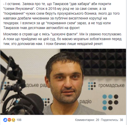 - И последнее. Заявка о том, что Тамразов "дал взятку" чтобы покрыть "схемы Януковича". Так в 2018 году не за сами схемы, а за "покрывание" чужих схем берут проукраинского бизника (бизнесмена), которого до этого наоборот долбили чиновники за публичное освещение коррупции на тендерах. И взялись за это "покрытие схем" сейчас, а не тогда когда Тамразов гнал десятками автомобили на фронт.