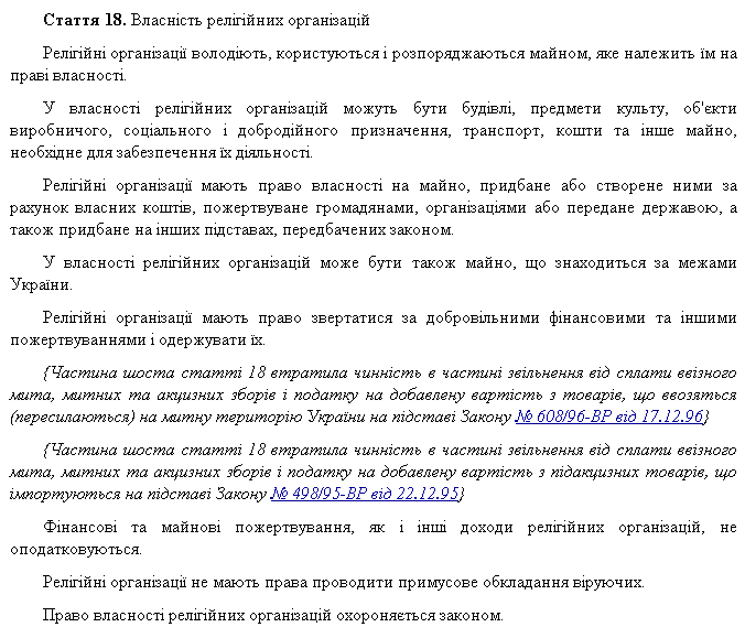 Согласно статье 17 Закона "О свободе совести и религиозных организаций" культовые здания и имущество, которые находятся в государственной собственности, передаются религиозным организациям в безвозмездное пользование по решениям областных и Киевской городской госадминистраций.