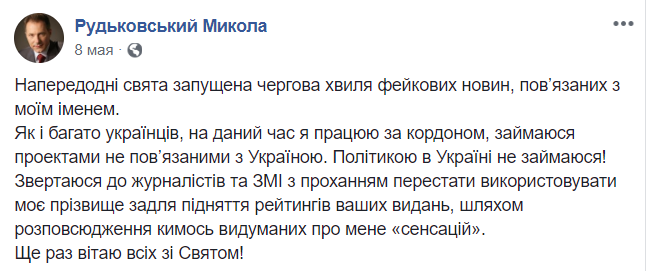 "Запущена очередная волна фейковых новостей, связанных с моим именем. Как и многие украинцы, в настоящее время я работаю за границей, занимаюсь проектами, не связанными с Украиной. Политикой в Украине не занимаюсь! Обращаюсь к журналистам и СМИ с просьбой перестать использовать мою фамилию ради поднятия рейтингов ваших изданий, путем распространения кем-то выдуманных обо мне "сенсаций", - написал он в Facebook 8 мая.