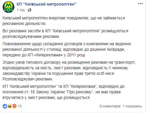 Журналисты тем временем начали выяснять заказчиков скандальной рекламы у подземки, но это еще более запутало ситуацию. Дело в том, что в киевском метрополитене сняли какую-либо ответственность с себя, переадресовав СМИ в КП "Киевреклама" и КГГА.