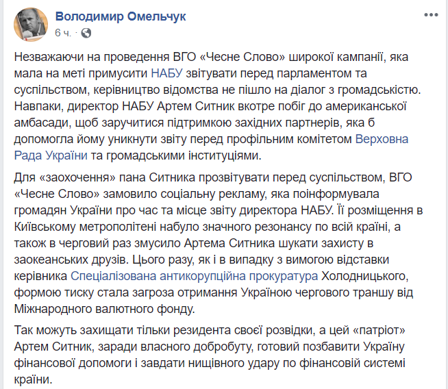 "Несмотря на проведение широкой кампании, которая носила цель вынудить НАБУ отчитываться перед парламентом и обществом, руководство ведомство не пошло на диалог с общественностью... Для "поощрения" господина Сытника к отчету, "Честное слово" заказало социальную рекламу, которой проинформировало граждан Украины о времени и месте отчета директора НАБУ. Ее размещение в киевском метрополитене приобрело значительный резонанс по всей стране, а также в очередной раз вынудило Артема Сытника искать защиты у заокеанских друзей", - написал Омельчук.