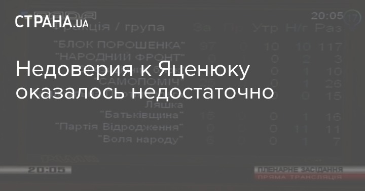 Тем не менее, в подкрепление президентских слов сторонники отставки прямо в сессионном зале начали активно собирать подписи, необходимые для рассмотрения вопроса ответственности правительства. Под резолюцией недоверия подписались 159 народных избранников – достаточно, чтобы поставить ее на голосование. Это было и сделано после того, как правительства поставили "неуд". Результат давал надежду, что резолюция пройдет. Не вышло, как и предсказывала "Страна". Для отставки действующего Кабмина не хватило 32 голоса. Практически полным составом поддержала резолюцию лишь фракция "Самопомочи". Даже президентская фракция, несмотря на все призывы, дала только 97 голосов за отставку. Большинство из фракций "Батькивщины" и Радикальной партии тоже было за увольнение Яценюка. Мало голосов было от депутатской группы "Воля народа" и фракции "Оппозиционного блока" (ОБ). Вообще не голосовали депгруппа "Видродження" и, естественно, фракция партии "Народный фронт" Яценюка.