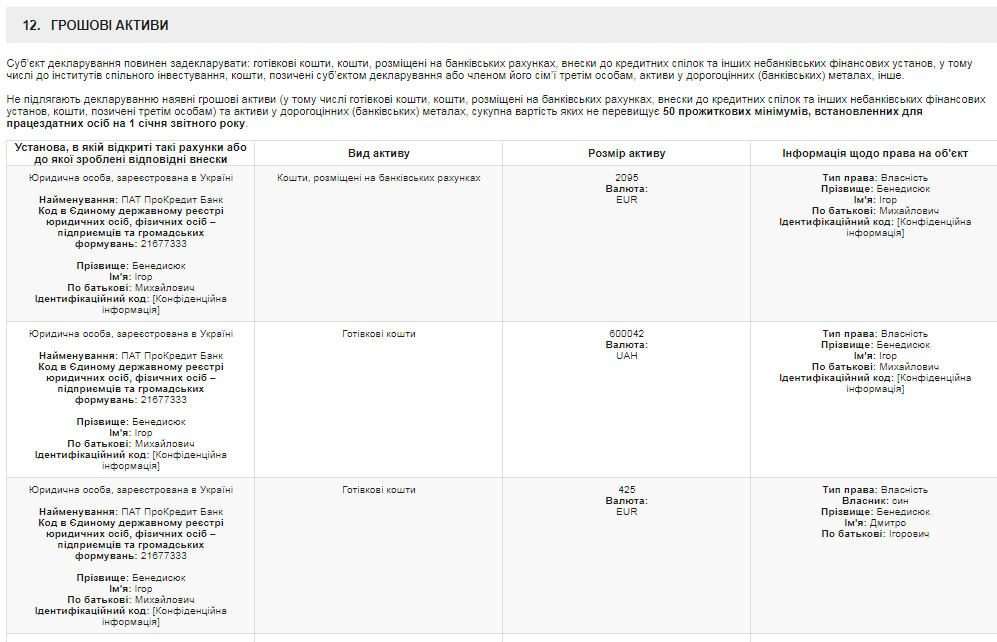 В разделе 12 "Денежные активы" декларации за 2017 год, которую Игорь Бенедисюк подавал в качестве главы ВСП он указал, среди прочего, наличные деньги - 20 тыс. евро, 15 тыс. долларов и 35 тыс. гривен. Еще он задекларировал вклады в "Приватбанке" 25 576 грн. у себя и 9 676 грн. у жены: