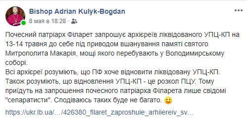 "Все архиереи понимают, что Филарет хочет восстановить ликвидированную УПЦ (КП). Также понимают, что восстановление УПЦ (КП) это раскол ПЦУ. Поэтому приедут на приглашение почетного патриарха только сознательные "сепаратисты". Надеюсь, таких будет мало", - написал на своей странице в Facebook епископ ПЦУ Адриан Кулик-Богдан 8 мая (позже, однако, он это сообщение удалил).