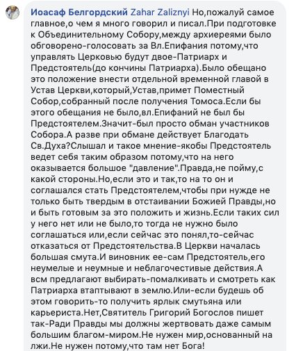 "При подготовке к Объединительному Собору между архиереями было обговорено - голосовать за Вл.Епифания потому что управлять Церковью будут двое - Патриарх и Предстоятель (до кончины Патриарха). Было обещано это положение внести отдельной временной главой в Устав Церкви, который примет Поместный Собор, собранный после получения Томоса. Если бы этого обещания не было, вл.Епифаний не был бы Предстоятелем. Значит - был просто обман участников Собора. А разве при обмане действует Благодать Св.Духа? Слышал и такое мнение - якобы Предстоятель ведет себя таким образом потому, что на него оказывается большое "давление". Правда, не пойму, с какой стороны", - написал Иоасаф.