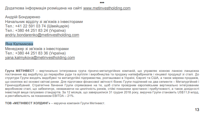 "Стране" удалось обнаружить чем занимается в "Метинвест холдинге" гражданская жена Максима Нефедова. Ее данные фигурируют в отчете корпорации перед инвесторами за 2018 год. Должность Яны Калмыковой указана здесь как "менеджер по связям с инвесторами":