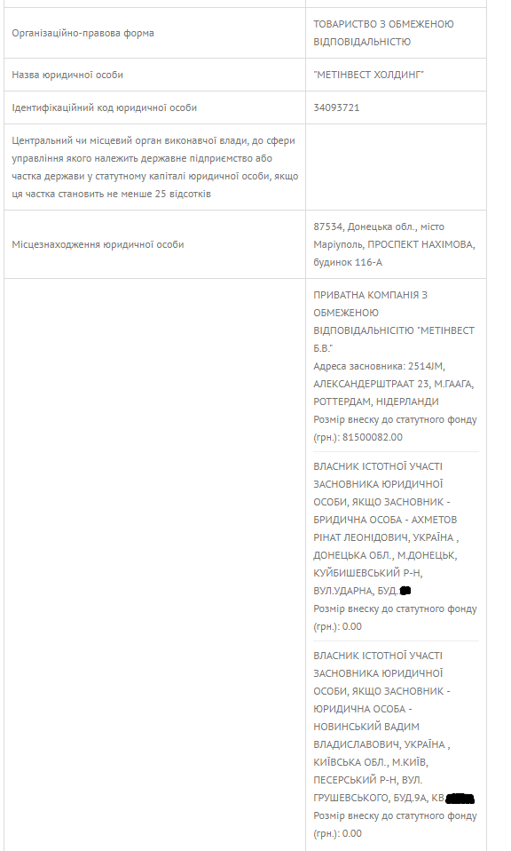 Конечными владельцами (бенефициарами) "Метинвест холдинга", согласно данным украинского реестра юридических лиц, являются Ринат Ахметов и Вадим Новинский: