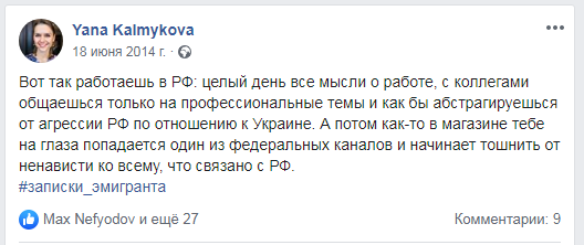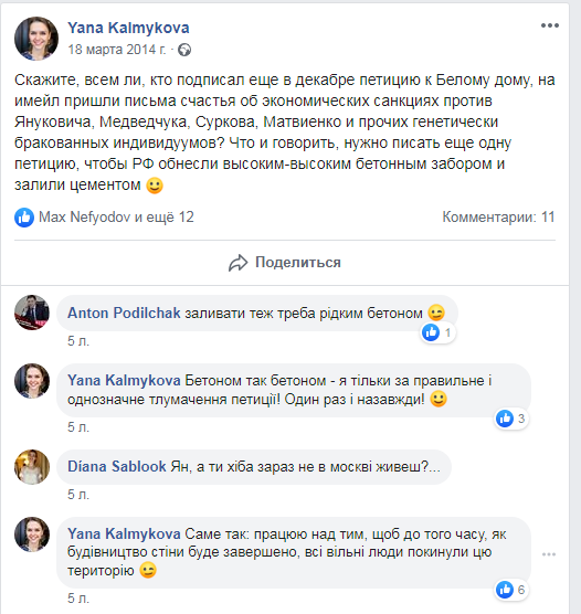 Раньше, 18 марта 2014 года, она предложила "писать петицию, чтобы РФ обнесли высоким-высоким забором и залили цементом". А в ответ на вопрос "Не в Москве ли сейчас живешь?" ответила "Именно так":