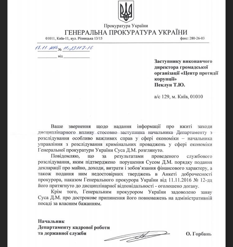 Ответ ГПУ о наложенном на Суса дисциплинарном взыскании – выговоре, источник фото: antac.org.ua