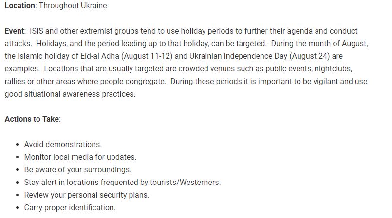 Оно заявило, что угроза атаки экстремистов у нас в стране такая же, как и у мусульман во время предстоящего праздника Курбан-байрам, где может совершить атаку ИГИЛ. То есть Украину в Штатах сравнивают не с Европой, а с Ближним Востоком.